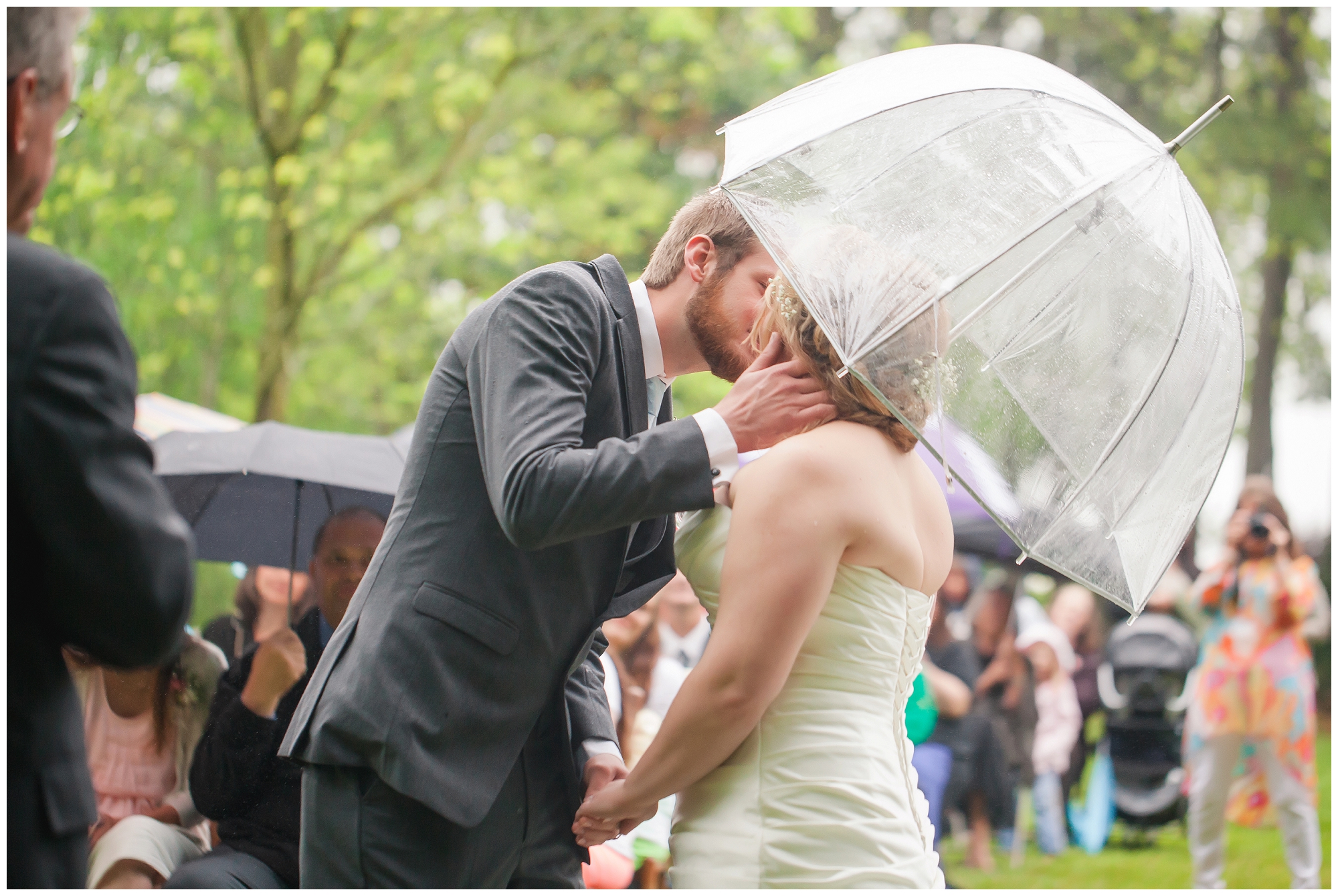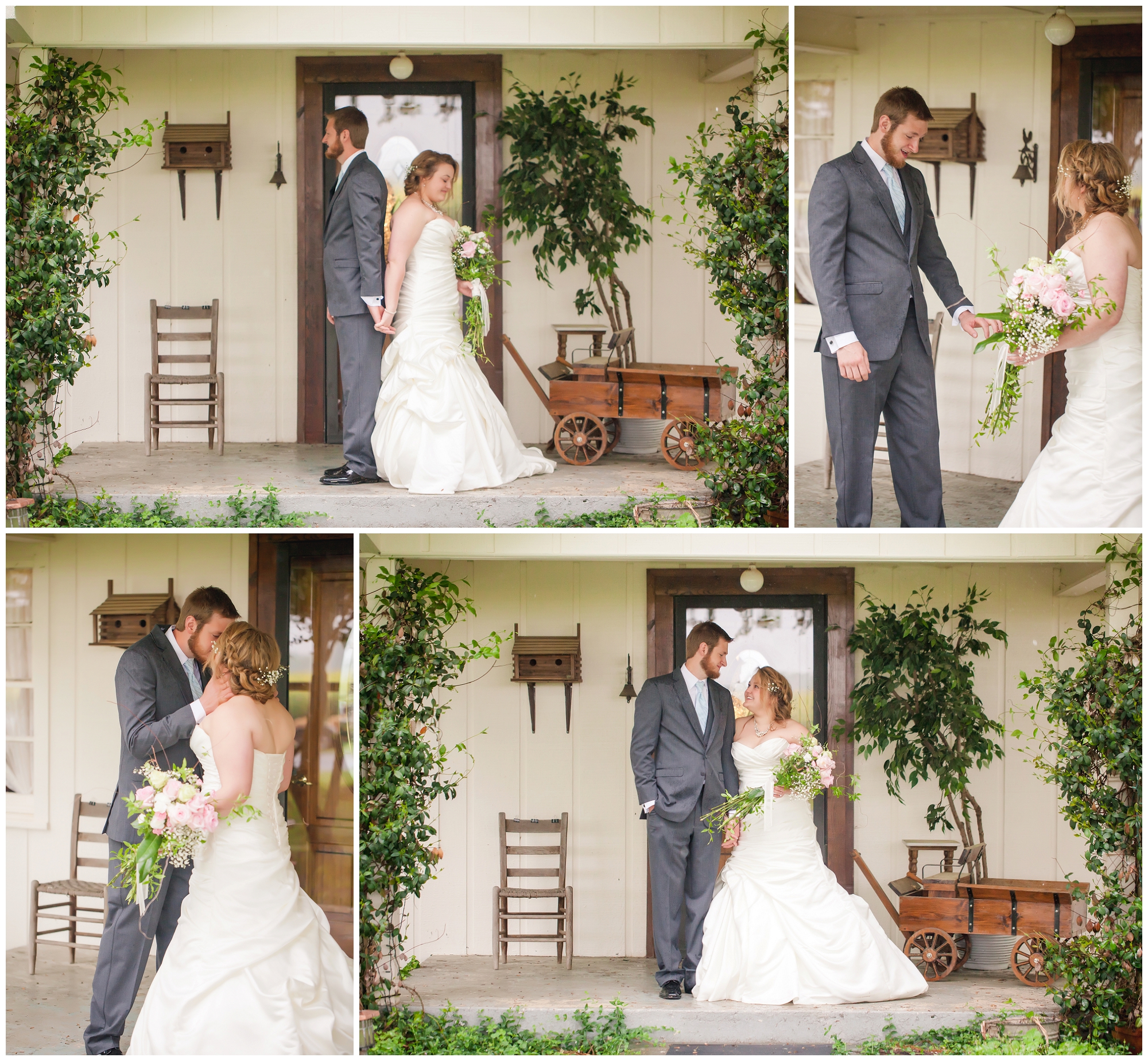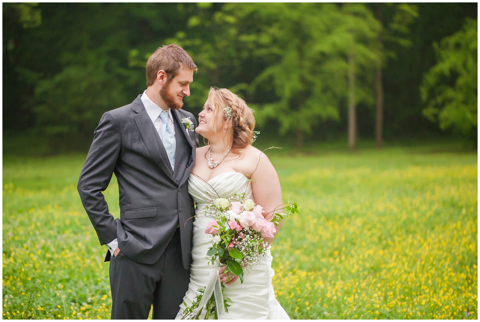 This sweet southern couple – oh my goodness. I showed up to their family home where Lindsey and her bridesmaids were singing and getting ready despite the rain falling outside. “It’s gonna be pretty no matter what!” she said. And she was so right! Once everyone was ready, Lindsey had just assumed that getting photos with her man beforehand wouldn’t happen. The rain had picked up, and even the space covered by trees were drenched. I told her to come out on the front porch, told her to face the left side and close her eyes. After this, I grabbed Kenny, told him to close his eyes, and slowly walked him into a wall through the house and onto the porch to face the right. I had them walk backwards to stand back to back, asked them to hold hands, and then when everything was perfect, I had them both turn around to see each other for the first time. A smile was permanently attached to Kenny’s face as he saw his bride. After they shared their moment together, we all prepared for the ceremony. Lindsey kept peeking out to see how many friends and family members had arrived, and she was giggling with excitement as the seats filled! So many loved ones came out in the rain with smiles on and umbrellas up, and laughter filled the air as they all talked about how beautiful the day was going to be. When the time came, Lindsey’s family took to a microphone, and they played and sang their hearts out as Lindsey walked down the aisle to her groom. And the rest? It’s history. Perfect southern romance history.
